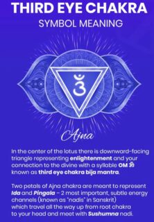 Ajna, or Third Eye Chakra, Is in the middle of the forehead. The profoundly spiritual indigo-coloured Ajna chakra is linked to the Pineal Gland. It enables the individual to see, hear, write and work with Spirit Guides. Physically, it relates to the left eye, nose, nervous system and lower brain. If imbalanced, it causes the individual to become cynical fearful, have little focus or concentration, develop headaches, eye problems or blindness and have vivid or unpleasant dreams.